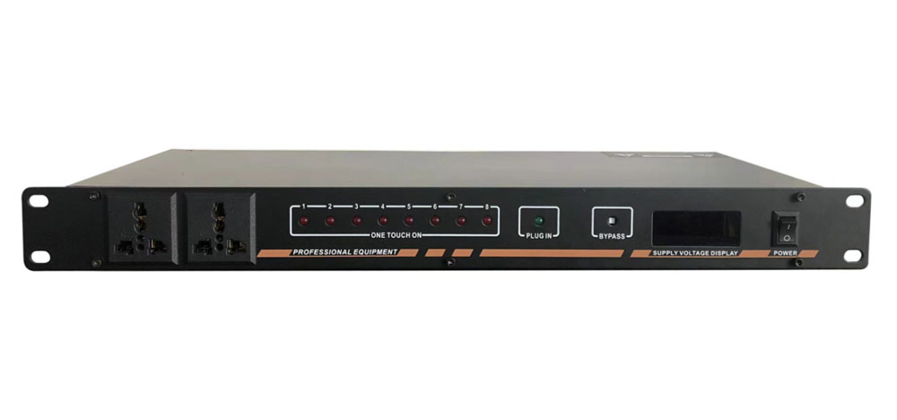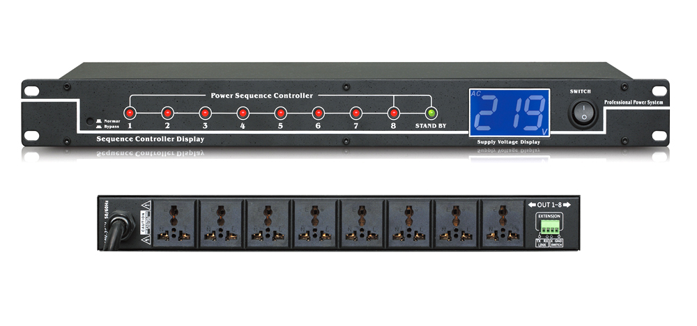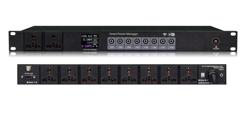 可控制电源8位全球通用万用插座输出,前面板2路万用插座输入直通电压输出,全打开模式,锁匙开启